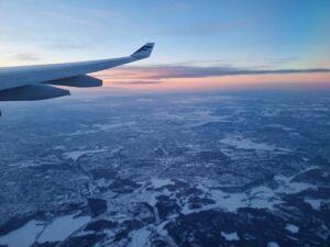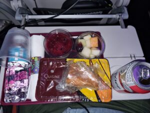 Lento lähti ajallaan ja kone oli aivan täysi. Olin saanut ikkunapaikan ja samalla rivillä oli Jorma ja Antti. Tarjolla oli kanariisiateria yhdellä juomalla lennon alkupuolella ja loppupuolella vielä muffinssi ja mehua.