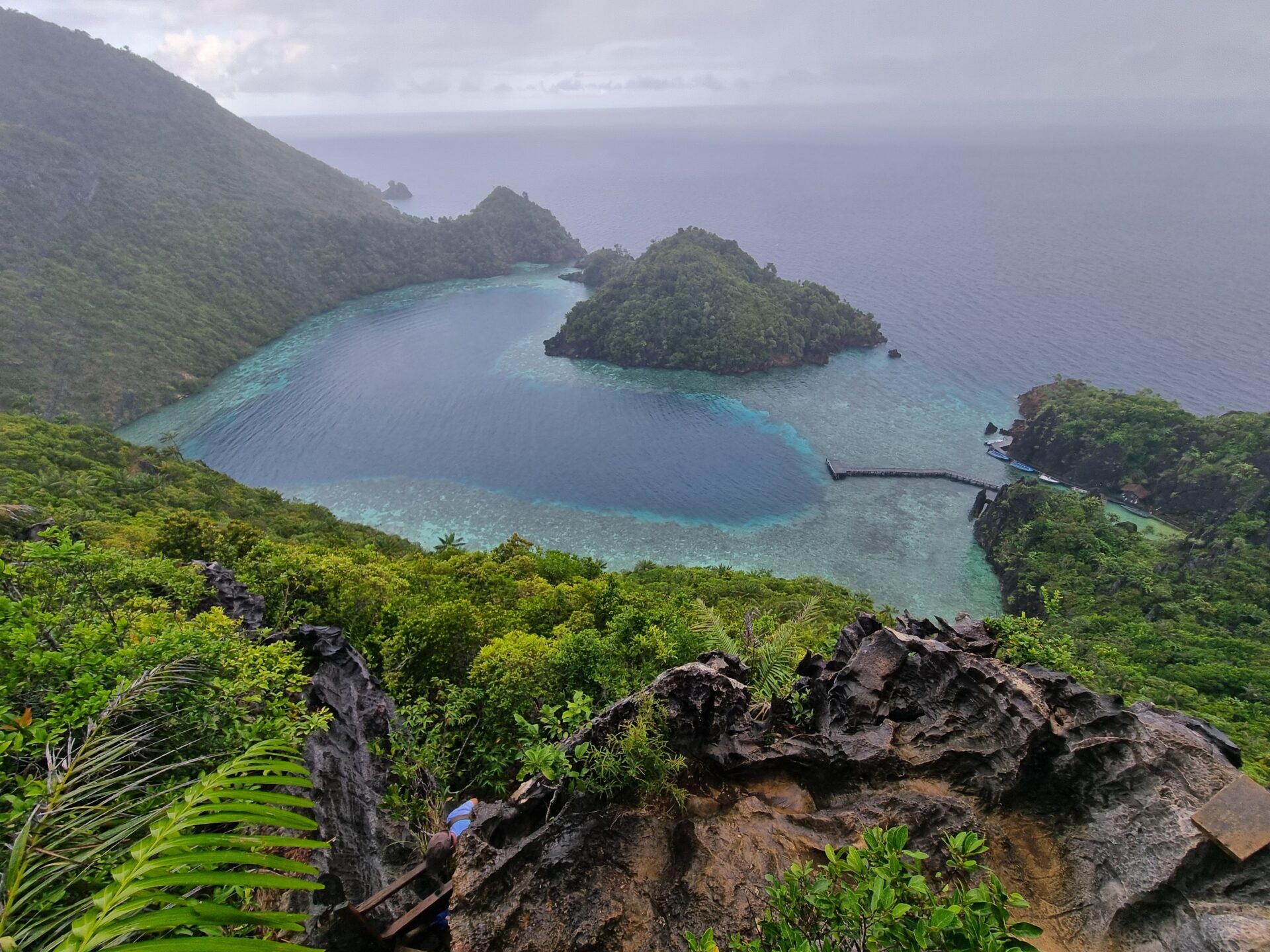 Harmillisesti oli aika sateista. Laitoin Montecin takin päälle sadetakiksi ja se oli hyvä idea. Veneelle vietiin laiturille jossa oli pieni lahti. Laiturin päästä kiikkerän tuntuiset portaat viidakon läpi jyrkkää rinnettä ylös 100 metrin korkeuteen. Ylhäällä olikin mahtava näköala, mutta silloin satoi aika rankasti, joten en montaa kuvaa ottanut. Alahaalla join pari kaljaa ja pummasin oppaalta yhden Kretek-tupakan. Sitten pieni uinti siinä lahdessa.