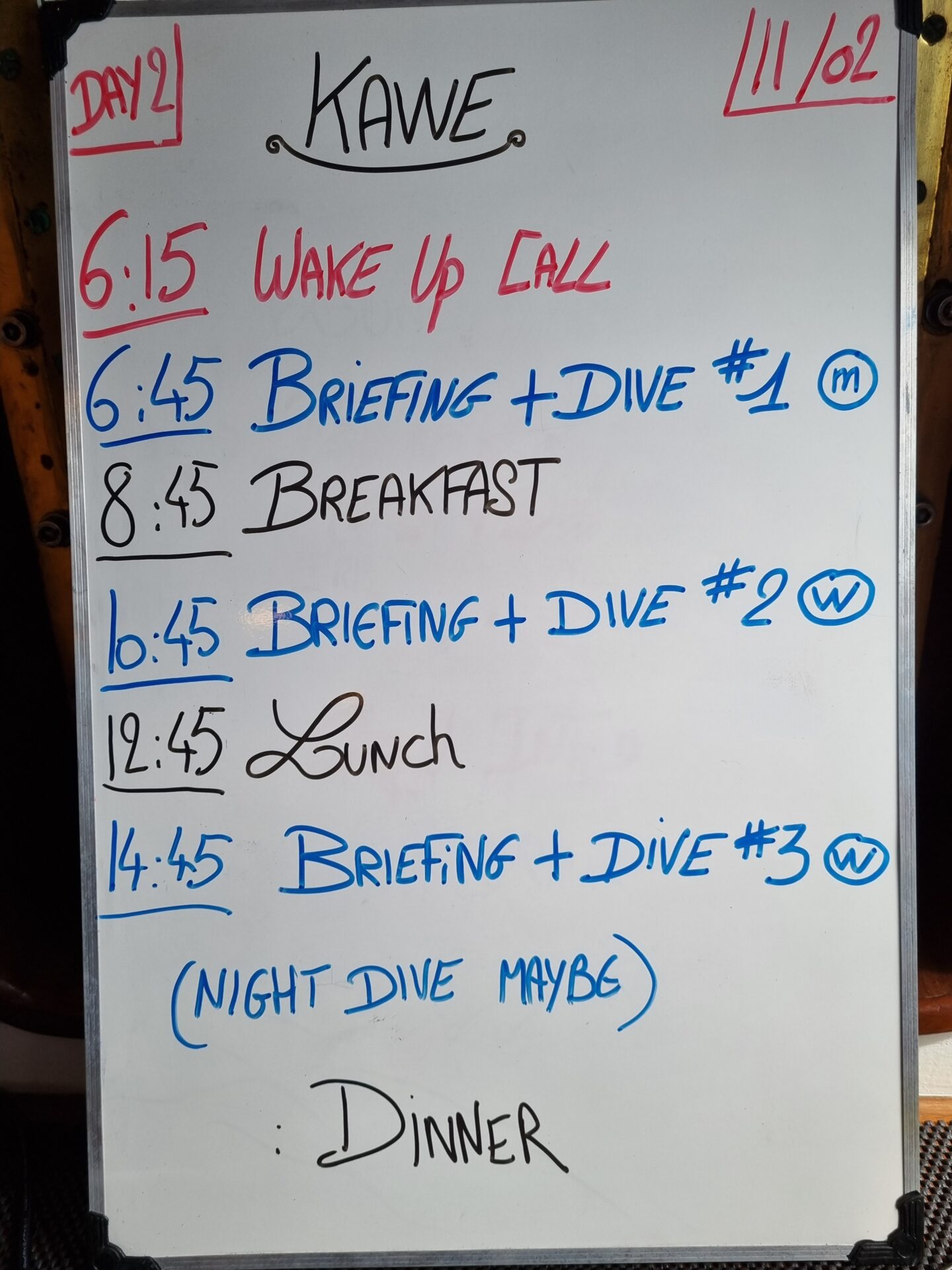 Nyt oli mahdollisuus sukeltaa enää aamupäivän 2 sukellusta, koska Seahorsen piti lähteä ajamaan pitkä merimatka heti lounaan jälkeen ja yön yli Sorongiin. Saksalaiset olivat lentämässä kotiin jo aikaisin seuraavana aamuna, joten he pystyivät tekemään vain ensimmäisen sukelluksen. Me muut pystyimme tekemään myöhemmänkin sukelluksen turvallisesti koska meidän lento oli vasta ylihuomenna ja saisimme yli 40 tuntia taukoa ennen lentämistä.
