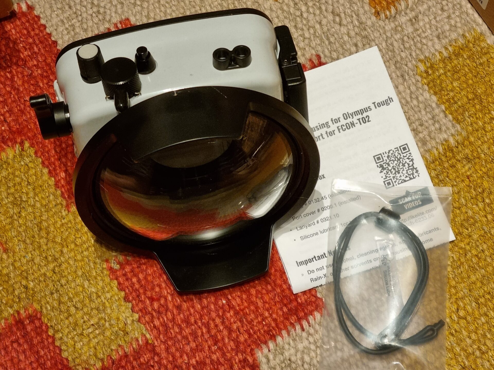 Sitten tilasin myös Ikeliten TG-kotelon dome-portilla, tuotekoodi 6233.14. Ja tähän koteloon menee sisään TG-6, jossa on FCON-T02 kiinni. Toisin kuin aiemmin käyttämäni märkä laajakulmalisäke AOI UWL-04, tämä optiikka on kuivana kotelon sisällä ja tuottaa optisesti laadukkaamman kuvan.